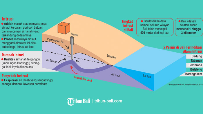 Berdasarkan hasil penelitian tahun 2018, lima daerah pesisir di Bali ditemukan terindikasi telah mengalami intrusi air laut.