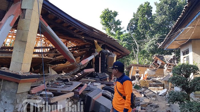 Perbekel Desa Ban melihat kondisi rumah warga yang ambruk diguncang gempa, Minggu (5/8/2018). Sebagian rumah warga rusak parah. Pura Subak Jongkok Asu, Dusun Bubung, Desa Abang Batudinding, Kintamani rusak akibat gempa.