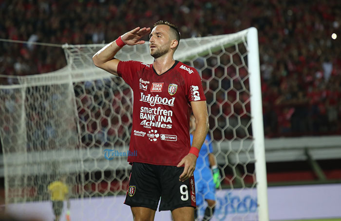 Penyerang Bali United, Ilija Spasojevic menambah keunggulan sementara Bali United menjadi 3-0 atas Badak Lampung FC.