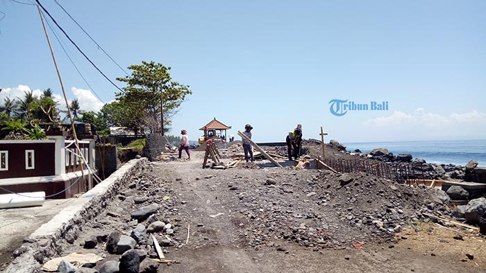 TRIBUN-BALI.COM, JEMBRANA - Jembatan penghubung di Pantai Jasri, Kelurahan Subagan, Kecamatan Karangasem, Karangasem, Bali, dalam proses perbaikan Pemerintah Daerah (Pemda) Karangasem.