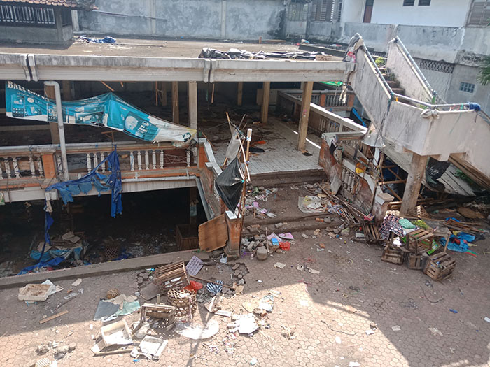 Seluruh kios yang berada di lantai satu hingga tiga Pasar Umum Gianyar sudah dibongkar, hanya menyisakan sisa-sisa material kayu, besi dan beberapa sisa dagangan yang rusak tidak terpakai.