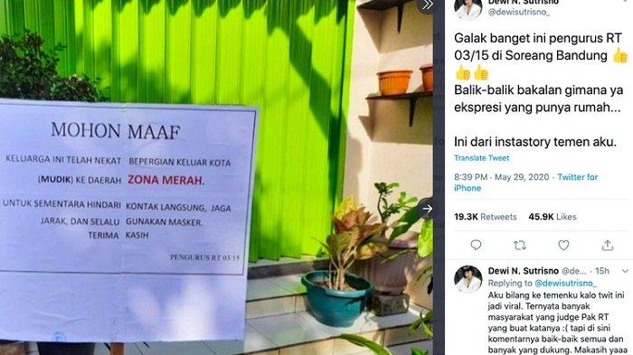 Beredar viral di media sosial Twitter sebuah postingan rumah warga yang dipasangi papan pengumuman karena nekat melakukan mudik Lebaran, Sabtu