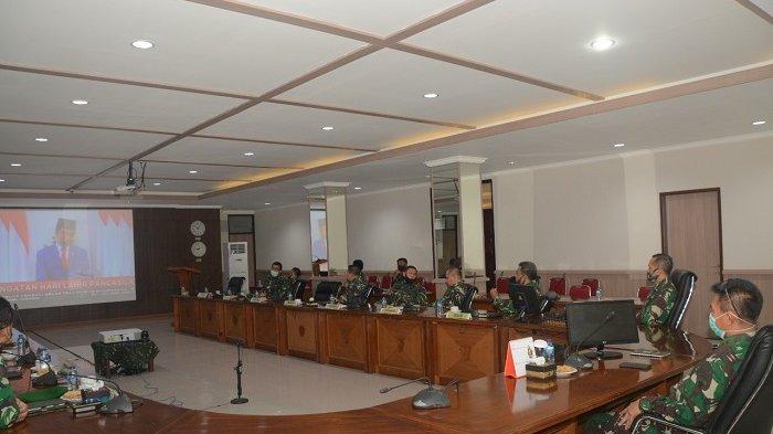 TRIBUN-BALI.COM, DENPASAR - Jajaran pejabat TNI Kodam IX/Udayana mengikuti Upacara Hari Lahir Pancasila yang dipimpin oleh Presiden RI Joko Widodo melalui video conference (Vidcon).