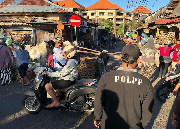 Satuan Polisi Pamong Praja (Satpol PP) Kota Denpasar diterjunkan ke lokasi untuk melakukan pengawasan guna memastikan aktivitas jual beli tetap mematuhi protokol kesehatan agar mengantisipasi transmisi lokal.