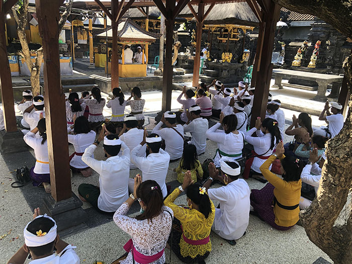 "Biasanya volume dari penangkil sangat padat sekali, sulit sekali untuk bergerak. Sekarang ini sangat berkuranglah, tidak seperti hari saraswati tahun tahun lalu," kata Agung Alit Mangku di sela-sela dirinya memandu persembahyangan pemedek.
