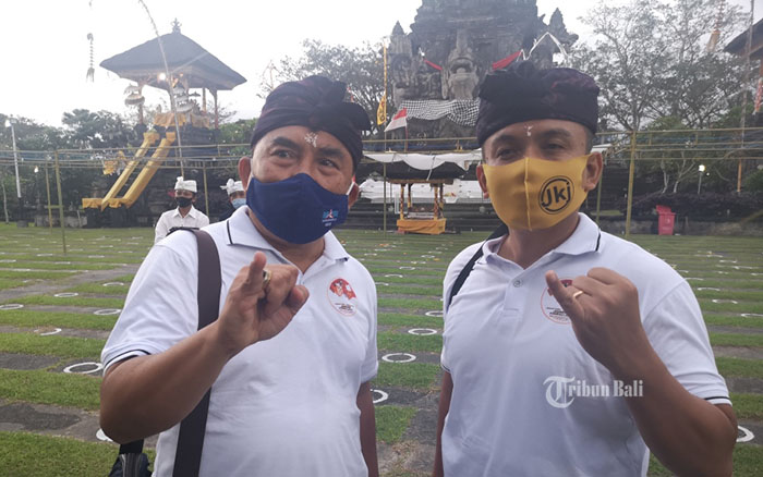 TRIBUN-BALI.COM, JEMBRANA - Pasangan calon dari Koalisi Jembrana Maju (KJM), I Nengah Tamba dan I Gede Ngurah Patriana Krisna alias Ipat, menggelar persembahyangan di Pura Jagatnatha Jembrana, Jembrana, Bali, Sabtu (5/9/2020).