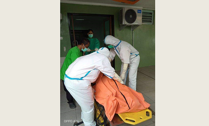 Petugas ambulans jenazah mengevakuasi jasad Mr.X menggunakan alat pelindung diri (APD) lengkap, hal ini sesuai prosedur penanganan pasien sakit maupun jenazah dalam masa pandemi covid-19.