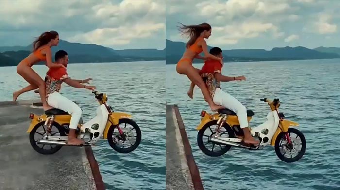 Dalam video, tampak WNA tersebut nekat melakukan aksi berbahaya dengan terjun ke laut sambil mengendarai sepeda motor.