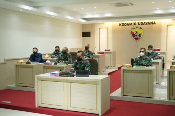 Kodam IX/Udayana kembali ikuti Rapat Koordinasi Satgas Penanganan Covid-19 melalui video conference di Ruang Yudha Puskodalopsdam IX/Udayana,