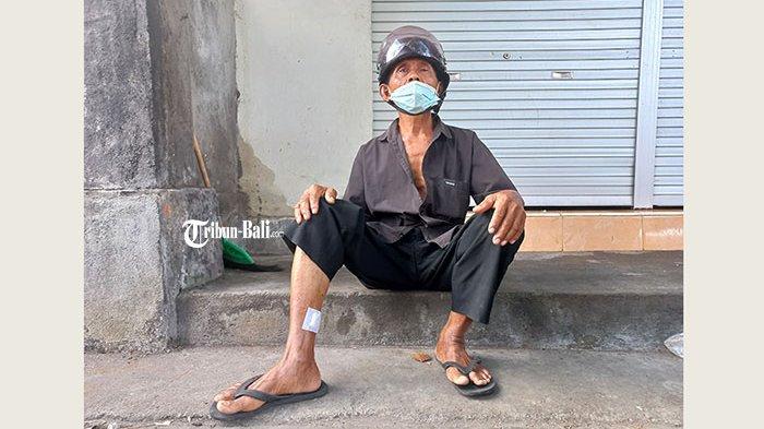 TRIBUN-BALI.COM, KLUNGKUNG - I Wayan Kerta (64) memperlihatkan kaki kanannya yang sudah tertutup perban, saat ditemui di seputaran Lingkungan Pegending, Kelurahan Semarapura Kauh, Klungkung, Bali, Senin 10 Mei 2021.