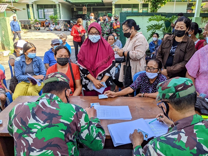 Para penerima bantuan ini juga wajib sudah divaksiansi. Jika belum, pihak Kodim 1610 Klungkung sudah menyediakan pos vaksinasi.
