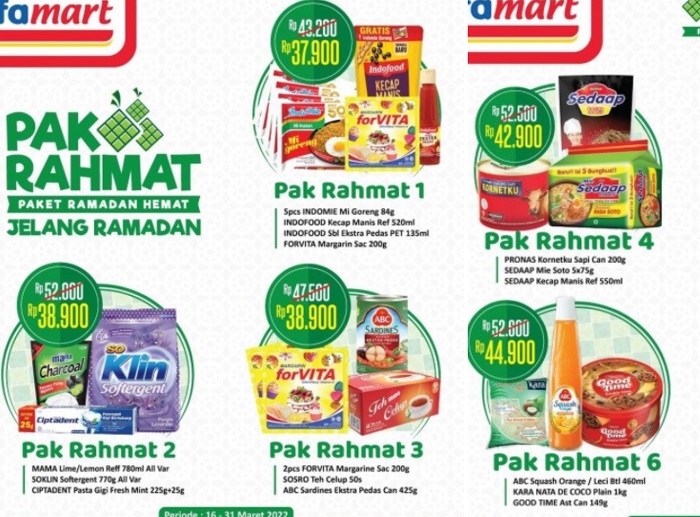 Jangan lupa ya untuk persiapkan kebutuhan harian selama puasa dan sahur nanti dengan dapatkan aneka produk Promo Pak Rahmat (Paket Ramadan Hemat) yang sudah tersedia di Alfamart terdekat.