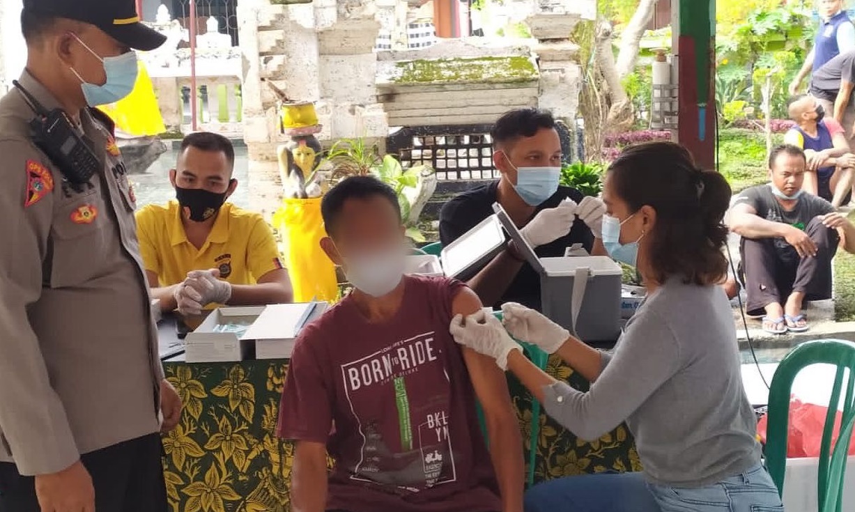 Vaksinasi dilakukan di Balai Banjar Bina Praja Lapas Singaraja, oleh petugas kesehatan dari Polres Buleleng.