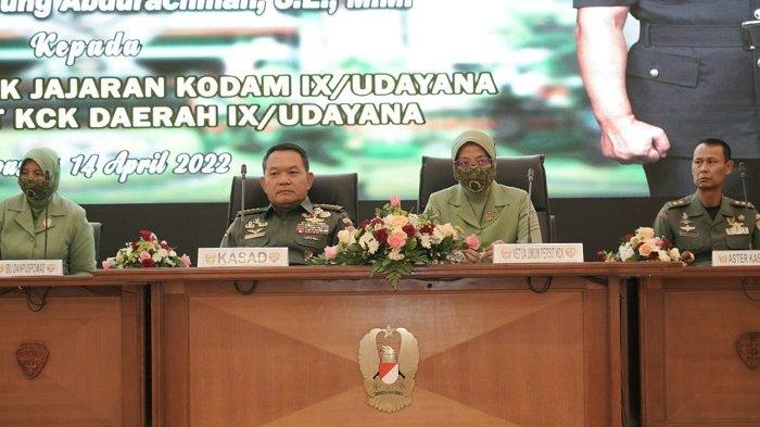 TRIBUN-BALI.COM, DENPASAR - Kepala Staf Angkatan Darat (Kasad) Jenderal TNI Dudung Abdurachman, S.E., M.M memberikan pengarahan kepada para Perwira Kodam IX/Udayana dalam agenda kunjungan kerjanya di Makodam setempat, Denpasar, Bali pada Kamis 14 April 2022.