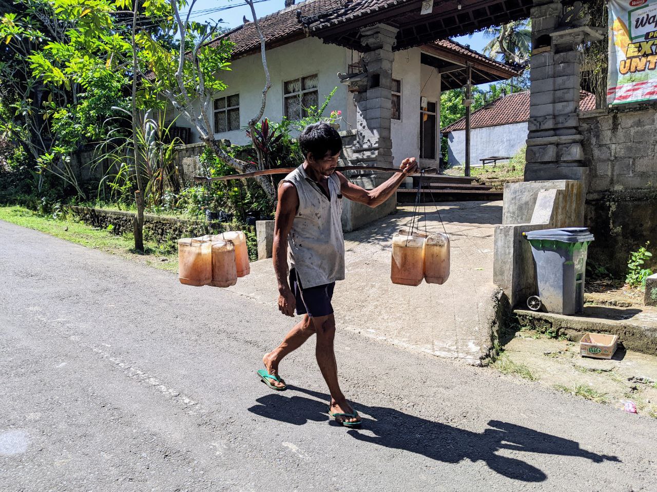 I Wayan Sugiarta (50), tampak memikul 5 jerigen nira kelapa ketika ditemui di Desa Besan, Kecamatan Banjarangkan, Klungkung, Senin 23 Mei 2022.