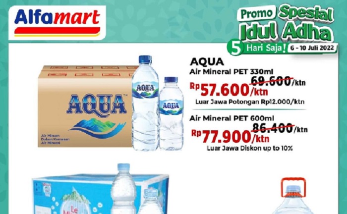 Promo Alfamart SPESIAL IDUL ADHA 8 Juli 2022, Aqua Dus 600ml Rp77.900, Le Minerale 600ml Rp76.800