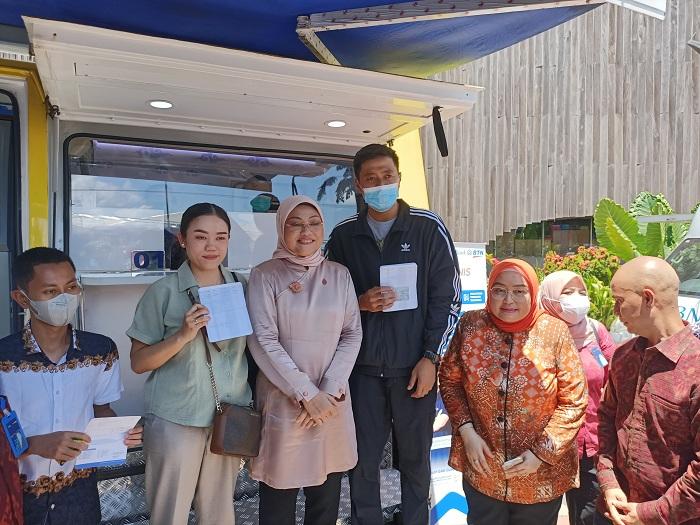 Puluhan penerima BSU di Badung melakukan pencairan di Krisna Oleh-Oleh Bypass melalui mobil kas keliling Bank BTN dan BNI.