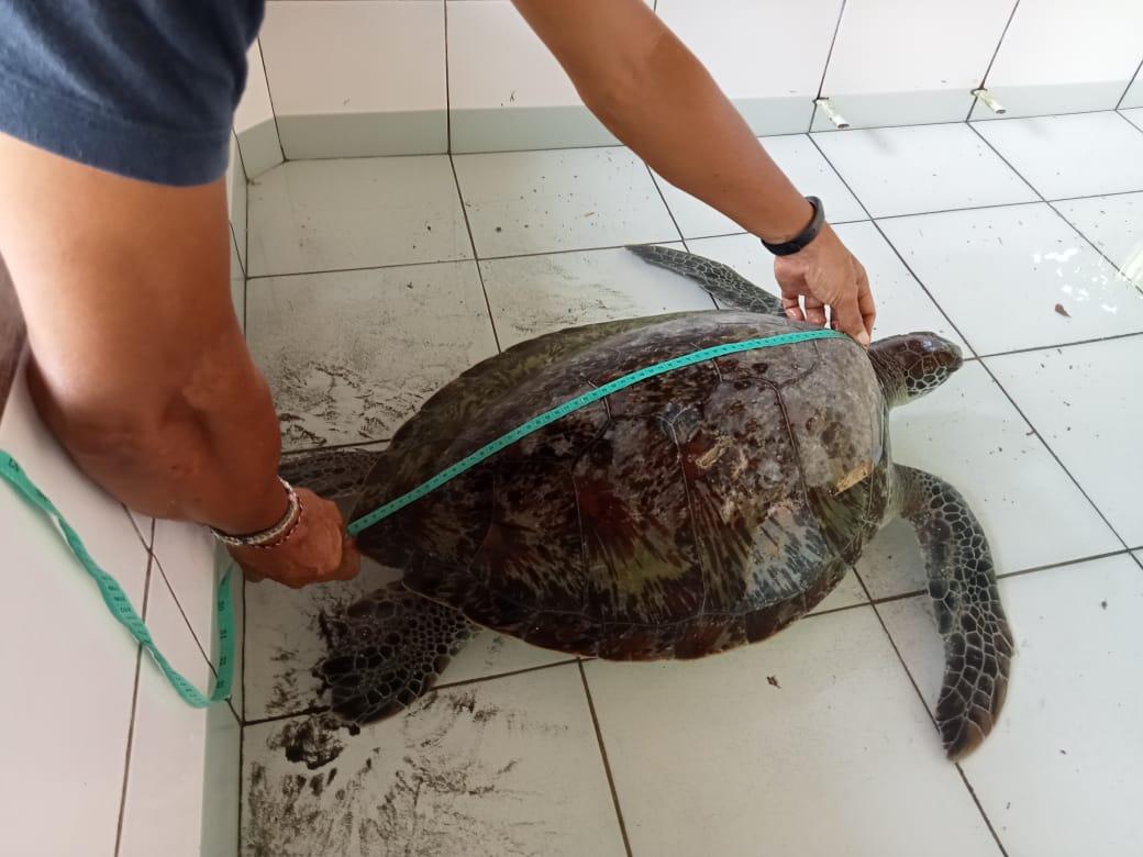 Menurut informasi yang diperoleh, penyu hijau tersebut berukuran paanjang 61 cm dan lebar 56 cm.