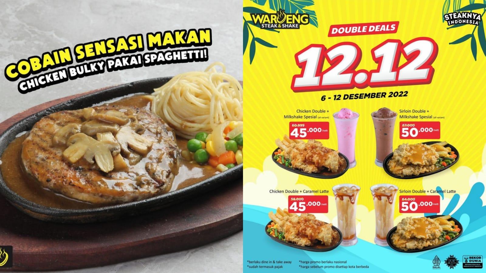 Promo 12.12 Waroeng Steak menghadirkan paket Double Deals berisi steak ayam hingga sirloin yang berlaku selama periode 6-12 Desember 2022.