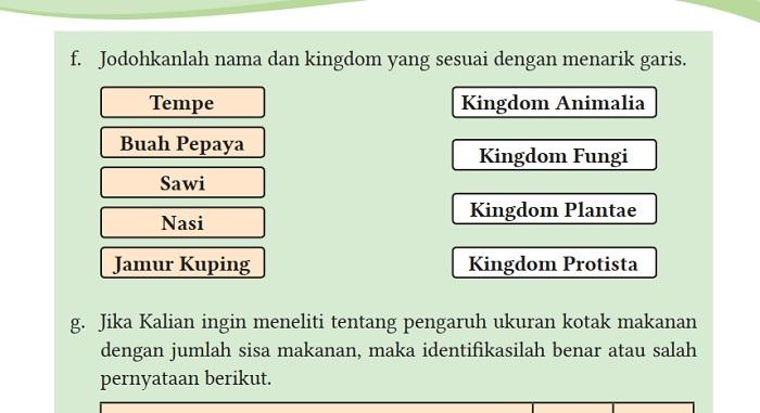 g. Jika Kalian ingin meneliti tentang pengaruh ukuran kotak makanan dengan jumlah sisa makanan, maka identifikasilah benar atau salah pernyataan berikut.