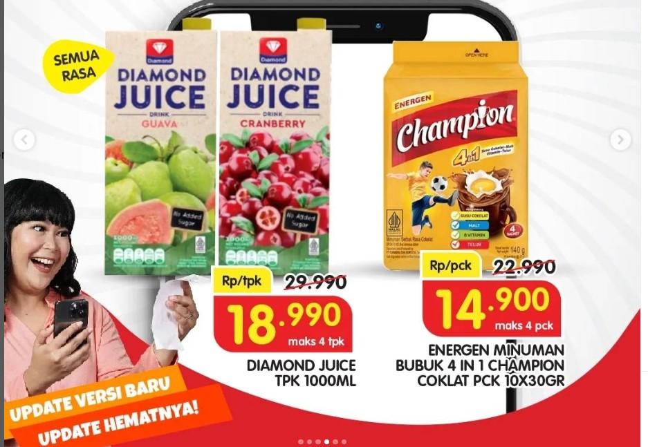 Diamond juice jambu/cranberry kemasan 1L diskon dari Rp29.990 menjadi Rp18.990 aja. Lalu ada Energen 4in1 champion coklat isi 10pcs seharga Rp14.900.