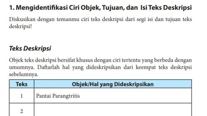 TRIBUN-BALI.COM, DENPASAR – Simak nih, berikut kunci jawaban Bahasa Indonesia kelas 7 halaman 3 4 5 6, Menentukan Ciri Isi dan Tujuan Teks Deskripsi.