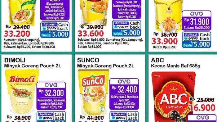 Filma minyak goreng 2L Rp33.900 Bimoli 2L Rp34.300 Sasa santan 65ml Rp4.500/2 Sunco minyak goreng 2L Rp34.400 Sania minyak goreng 2L Rp32.500 Tro