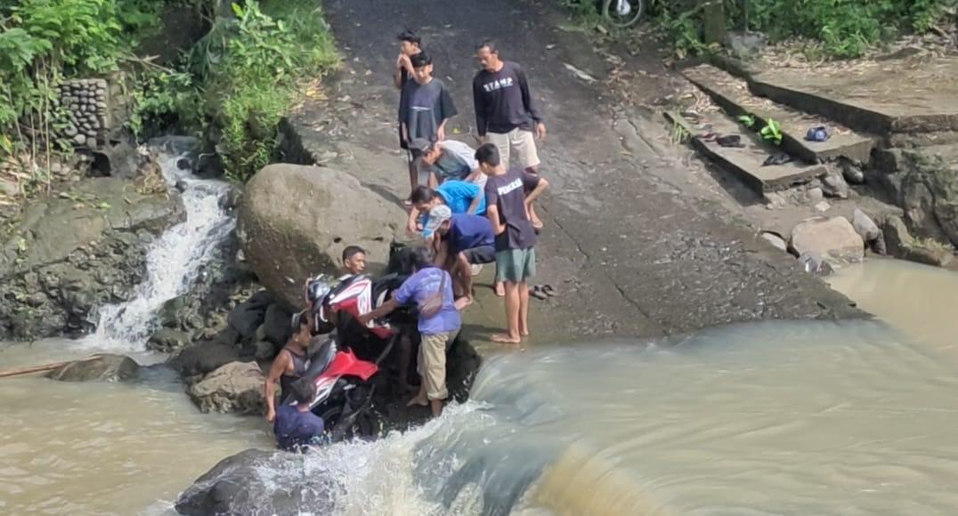 Dani mengendarai motor Yamaha Mio AG 3009 XU yang terseret arus di Sungai Yeh Matan.