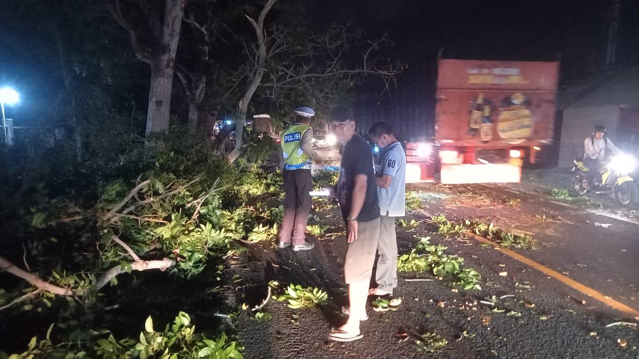 Pohon perindang jenis mahoni yang berdiameter sekitar 50 centimeter tersebut, tumbang lantaran diseruduk truk kontainer. Beruntung tak ada korban jiwa dalam peristiwa tersebut. Namun sempat menyebabkan gangguan lalu lintas.