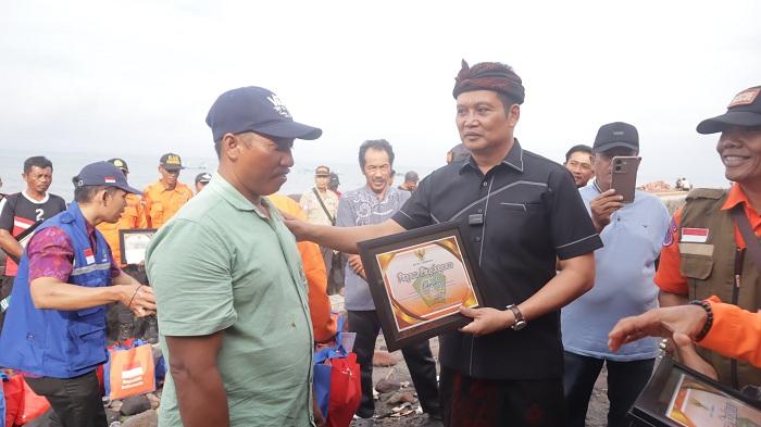 Penghargaan diserahkan di pesisir Pantai Pebuahan, desa Banyubiru, Selasa 8 Juli 2025. Pemberian penghargaan ini sebagai bentuk apresiasi Pemerintah kabupaten Jembrana, atas perjuangan para nelayan dan relawan dalam menolong para korban kapal Tunu Pratama Jaya.