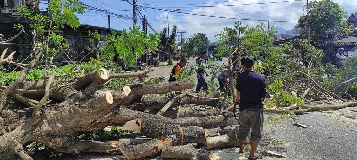 Kali ini, sedikitnya ada empat pohon yang ditangani. Sebab pohon perindang, pinggir jalur nasional ini berpotensi tumbang dan dapat membahayakan pengguna jalan.