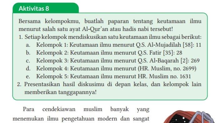 Soal yang akan kita selesaikan adalah soal pada halaman 14 pada kegiatan siswa Aktivitas 8 tentang keutamaan ilmu menurut ayat Al-Qur’an.