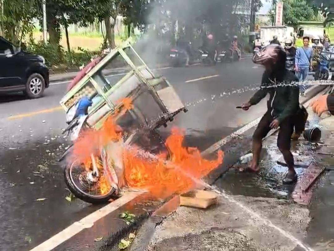 Motor Rombong Bakso Terbakar di Jalan Raya Akah Klungkung Bali, Warga Gotong Royong Padamkan Api