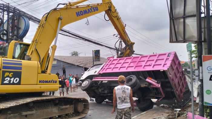 Evakuasi truk yang terguling dengan mempergunakan satu unit Ekskavator ukuran besar. (zae)
