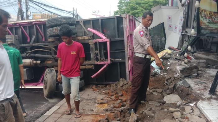 Dalam situasi panik, pengemudi truk sempat membanting setir ke kiri, namun nahas, kendaraan berat itu malah naik ke atas trotoar.