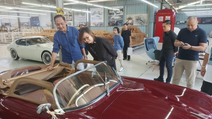 Pendiri Tuksedo Studio Pudji Handoko (kiri) saat mendampingi kunjungan Wamen Ekraf Irene Umar (kanan) di Workshop Tuksedo Studio. Permintaan Ekspor Mobil Classic Tuksedo Studio Tinggi, Namun Terkendala Regulasi