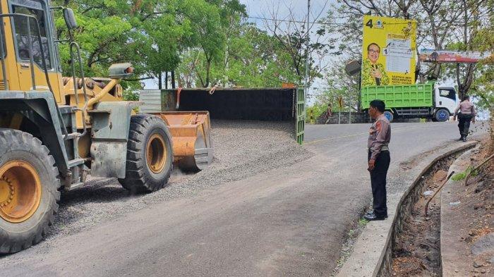Truk Pengangkut Coral Terguling di Jalan Raya Tulamben Kecamatan Kubu Karangasem