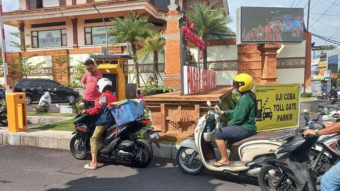 Kendaraan tampak mengular di pintu masuk Pasar Umum Semarapura, Klungkung, Bali, Kamis (1/8/2024) saat ujicoba palang parkir otomatis.