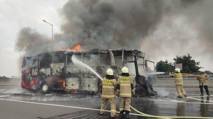 Setelah BAN pecah, muncul percikan api di bagian ban dan menyambar hingga menghanguskan seluruh bagian bus.